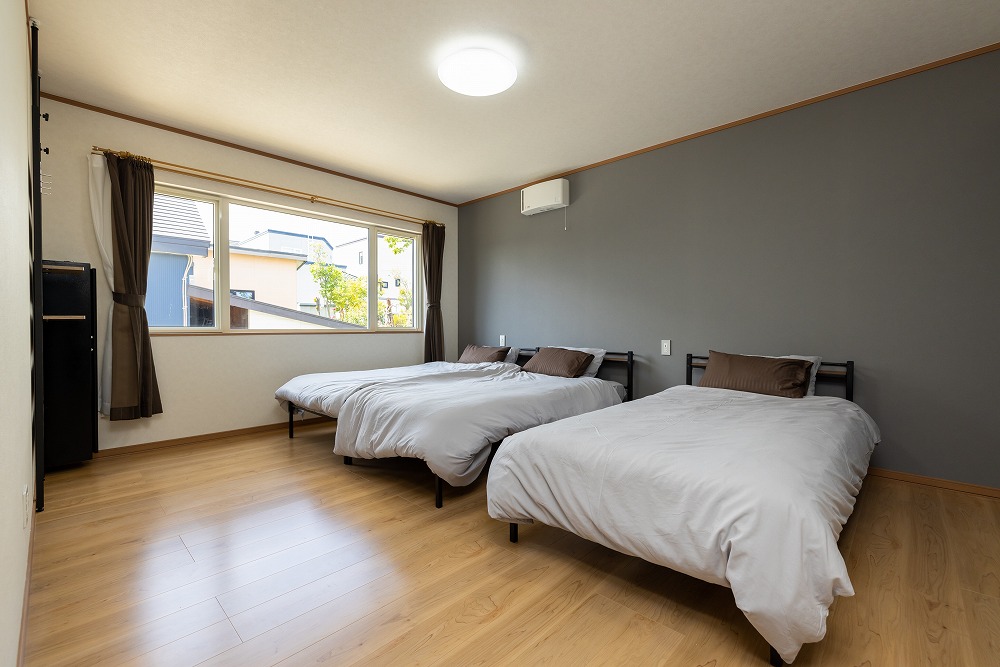 1~5人向けの室内はベッド3台とソファベッド、布団2組完備しています。キッチン・お風呂・洗濯機・Wi-Fi・大画面プロジェクターやDolby音響、各種家電・調理器具・アメニティも揃っています。
